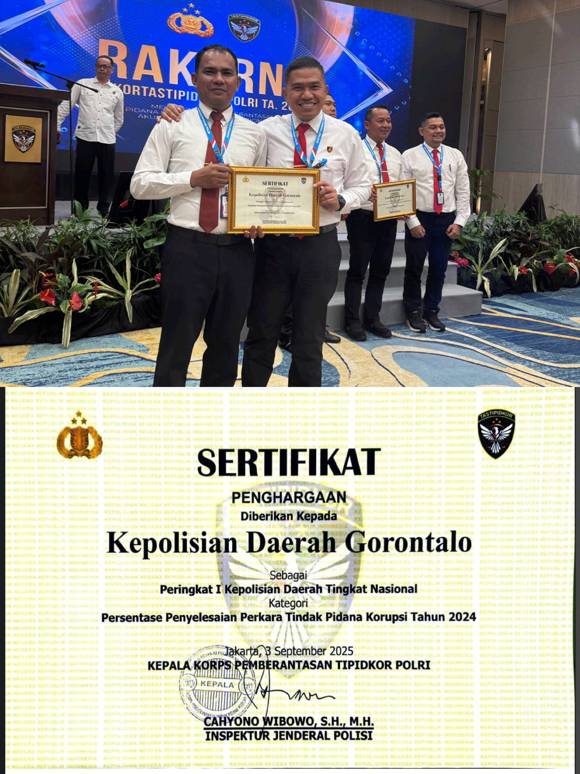 Dalam sertifikat penghargaan yang diterima, Polda Gorontalo dinilai menunjukkan komitmen kuat, konsistensi, serta kinerja optimal dalam menuntaskan berbagai kasus korupsi sepanjang tahun 2024- 2025. Capaian ini menjadi bukti nyata kesungguhan jajaran kepolisian Gorontalo dalam menghadirkan penegakan hukum yang transparan, profesional, dan berintegritas tinggi. Direktur Reserse Kriminal Khusus Kombes Pol. Dr. Maruly Pardede, S.H., S.I.K., M.H., mengungkapkan rasa syukurnya atas apresiasi nasional tersebut. Menurutnya, keberhasilan ini adalah buah kerja keras seluruh personel yang tak kenal lelah dalam mengawal penegakan hukum di daerah.