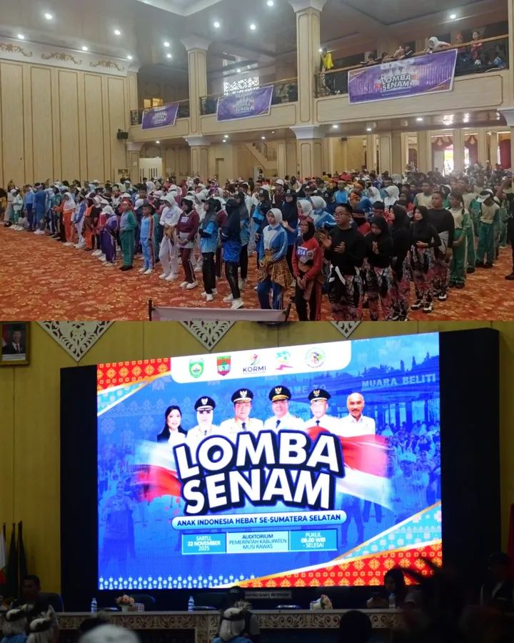 koranwantara.com Musi Rawas – Kegiatan Lomba Senam Anak Indonesia Hebat se-Sumatera Selatan Tahun 2025 berlangsung meriah dan penuh antusiasme. Acara yang diselenggarakan di Gedung Auditorium Pemkab Musi Rawas, Sabtu (22/11/2025) diikuti oleh peserta dari berbagai daerah di Sumatera Selatan ini menjadi ruang positif bagi anak-anak untuk berkreasi, bergerak aktif, serta menumbuhkan semangat hidup sehat.