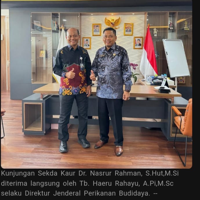 Sekretaris Daerah (Sekda) Kabupaten Kaur, Dr. Nasrur Rahman, S.Hut., M.Si., melakukan kunjungan kerja ke Direktorat Jenderal Perikanan Budidaya dan diterima langsung oleh Direktur Jenderal Perikanan Budidaya, Tb. Haeru Rahayu, A.Pi., M.Sc.