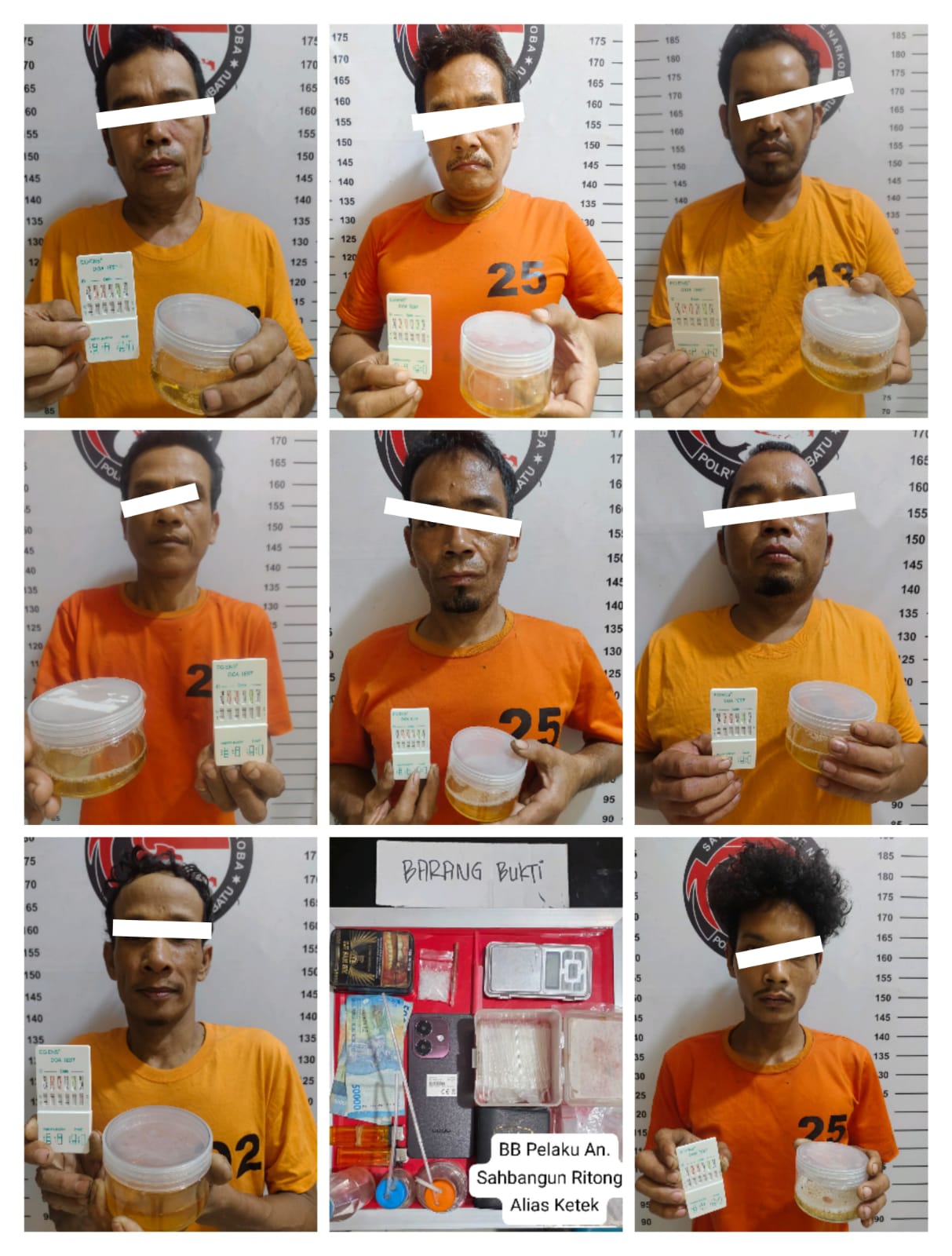Bukan hanya menyita sabu, tim Sat Narkoba Polres Labuhanbatu juga mengamankan tujuh pria lainnya yang berada di lokasi. Ketegasan petugas terbukti saat hasil tes urine menunjukkan hasil yang seragam, kedelapan orang tersebut, termasuk Ketek, dinyatakan positif Metamfetamina.